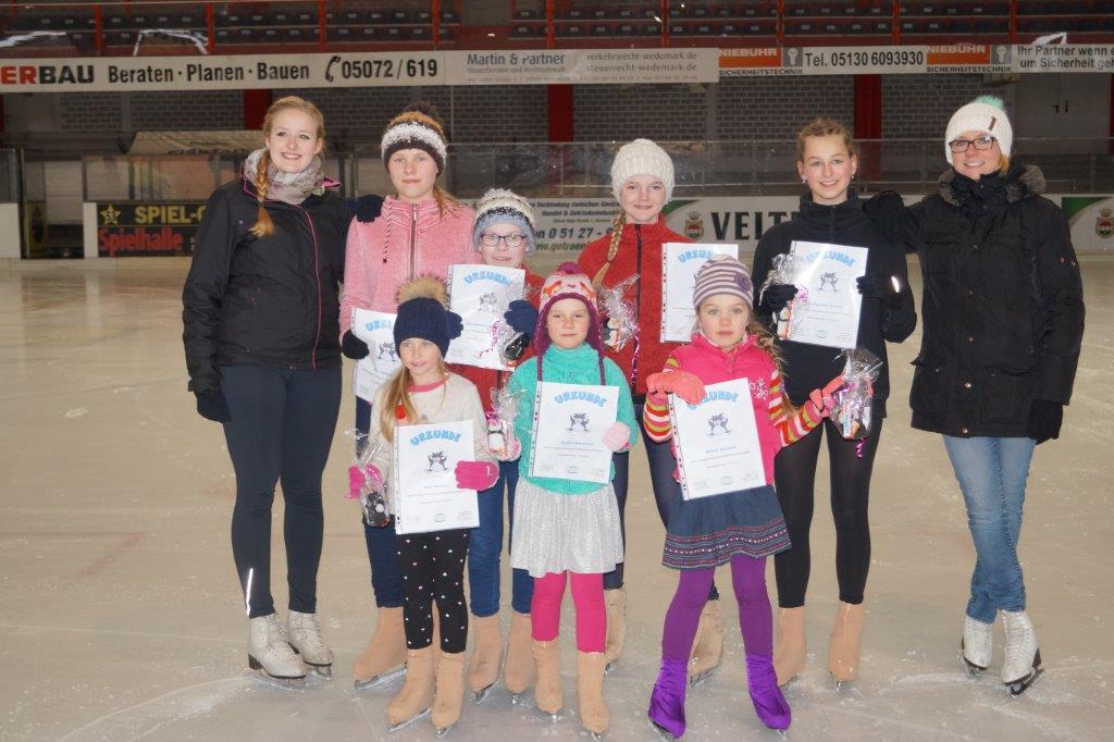 Dieses Jahr fand wieder die vereinsinterne Pinguinprüfung auf dem Eis statt. Sieben Läuferinnen zeigten die Grundelemente Pinguin, Hocke, Eierlaufen und Hochspringen. In diesem Jahr freuten sich Nele Bigalke, Sophia Neubauer, Beena Janssen, Tilla Zeymer, Charlotte Gerner sowie Mira und Karolina Heitland über die Urkunden und den Plüschpinguin, den sie von Jeannette Buhs und Svenja Adam überreicht bekamen.