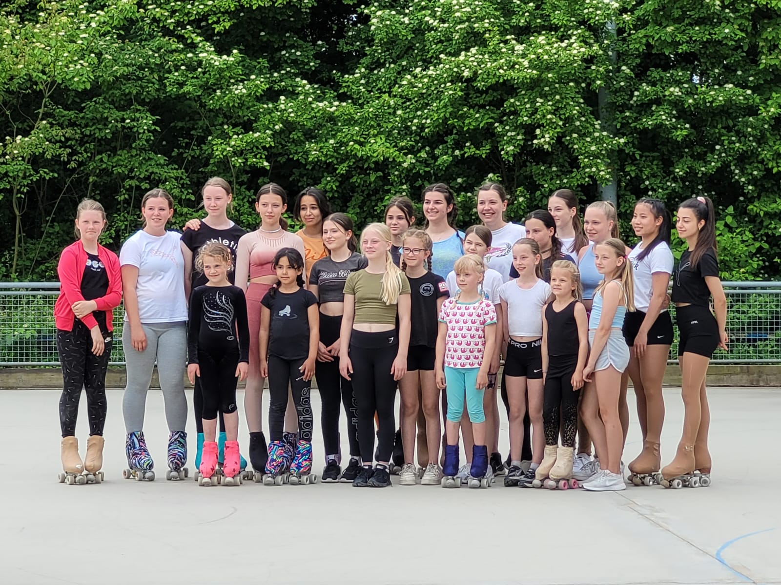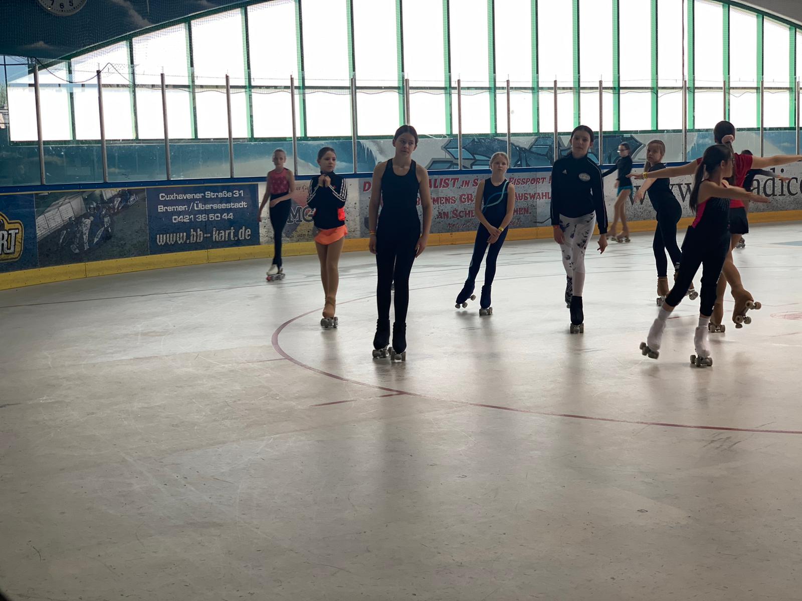 Von der REG fuhren Hanna Ben Moussa, Tessa Bischof, Luna Stöver, Merle Behrens, Minou Monpetain, Samira Gencceylan, Clara Koziolek und Sabrin Ben Moussa mit ihren Trainerinnen Jessica und Sarah Dölle zur Außenbahn der Sporthalle Nord. Insgesamt absolvierten 29 Läuferinnen Sprung-, Athletik-, Spinner- und Pirouettentraining. Während am Samstag die Sonne durchgängig schien, war es am Sonntag bewölkter, und der Lehrgang konnte vor den ersten Regentropfen beendet werden.