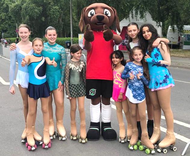 Fortwährend führten unsere Läuferinnen Figuren und Elemente vor und mischten sich unter die Besucher, um Flyer zu verteilen. Besonders aufgeregt waren alle Teilnehmerinnen, als sie von einem Kamerateam von RTL Nord gefilmt wurden und als eine Fotografin der HAZ Bilder von ihnen machte. Viel Spaß gab es auch beim Foto mit Eddi, dem Maskottchen von Hannover 96.